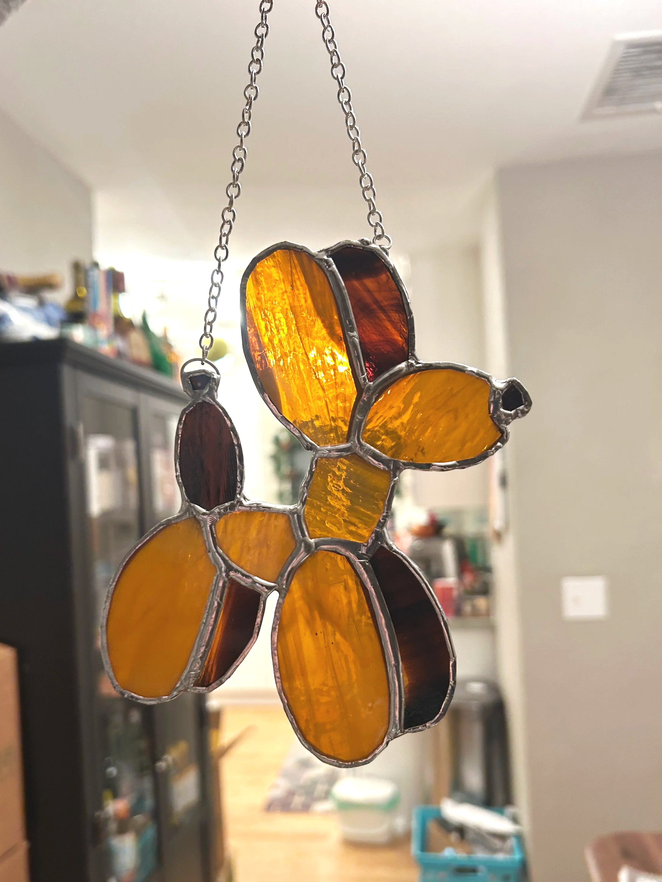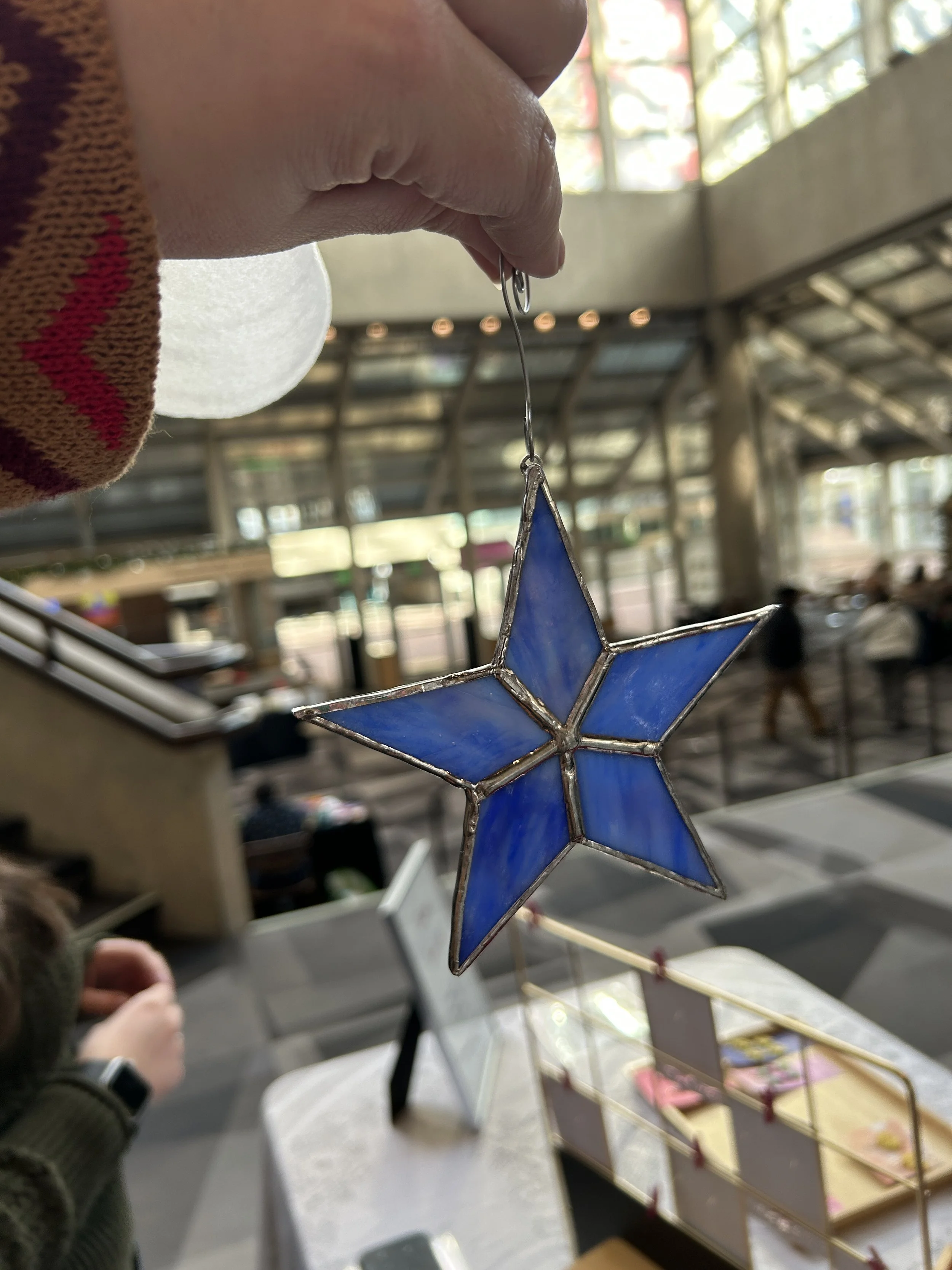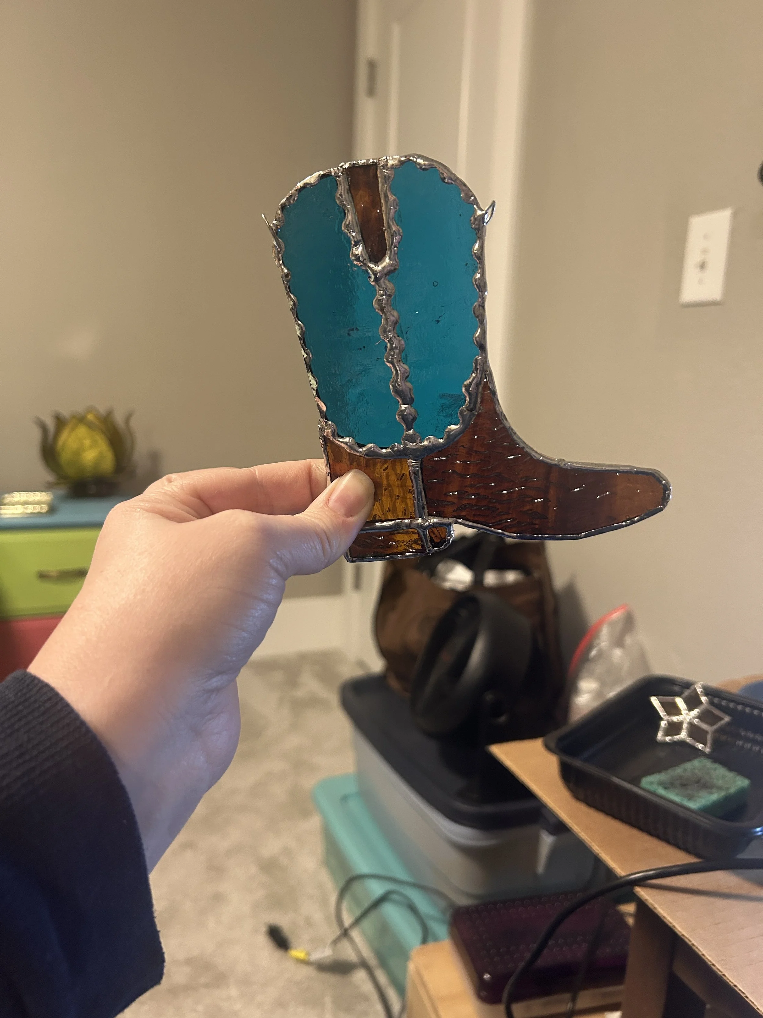 I am a theatrical props supervisor by day and a stained glass artisan by night! My work is inspired by the whimsy of life and aims to be a fun bit of art in someone’s space. I mostly make sun catchers to live in a sunny window for those looking for some window gems in their homes!